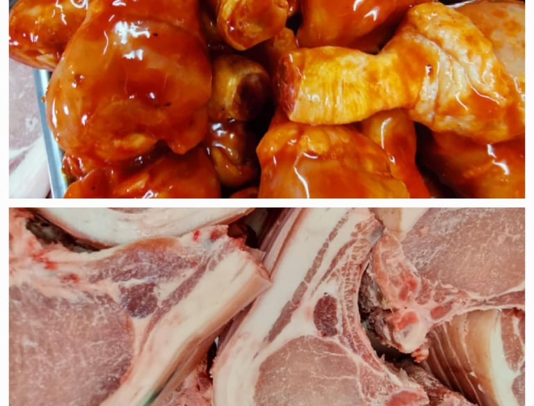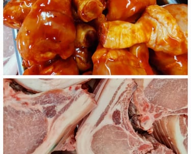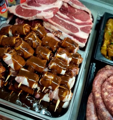 Lemon & Herb Chicken Sosaties, Chicken Sosaties, Texan Steak Chicken Pieces, SixGun Drumsticks, SixGun Drums, Pork Belly Sosaties, Pork Loin Chops, Pork Sausages, Pre-Cooked Rib Patties, Oepsies, BBQ Oepsie